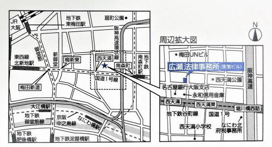 阪神高速環状線「北浜出口」を降り、出口を左折します(堺筋に入ります)。右車線を走行して、西天満の交差点